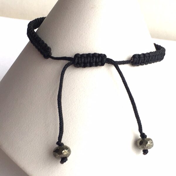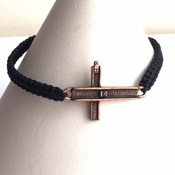 The Ground Zero “9/11 Cross” inspired my design as a sign of “faith and hope!” The bracelet is trimmed with Pyrite beads. The Pyrite stone is thought to have strong spiritual grounding abilities and also helps boost your personal power. This amazing Ground Zero Cross in an antique copper tone finish is 1” long x ¾” wide on an adjustable (6-1/2”-8”) black macramé bracelet, versatile for both men and women.