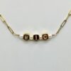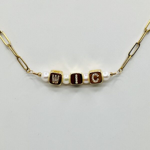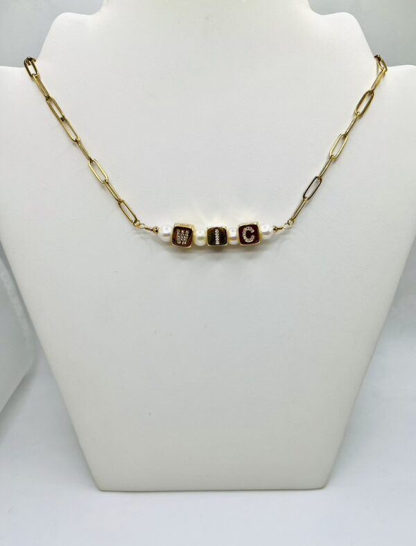 The WIC Necklace, is on trend, with gold plated, paper clip stainless steel chain, adjustable, 18 inches long, with pave mini cubic zircon cube letter beads, and Freshwater Pearls (6mm), spacer beads.